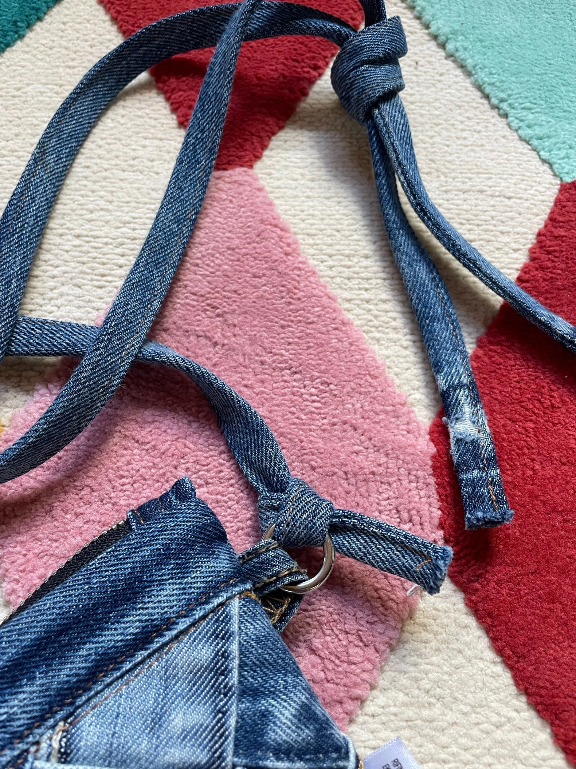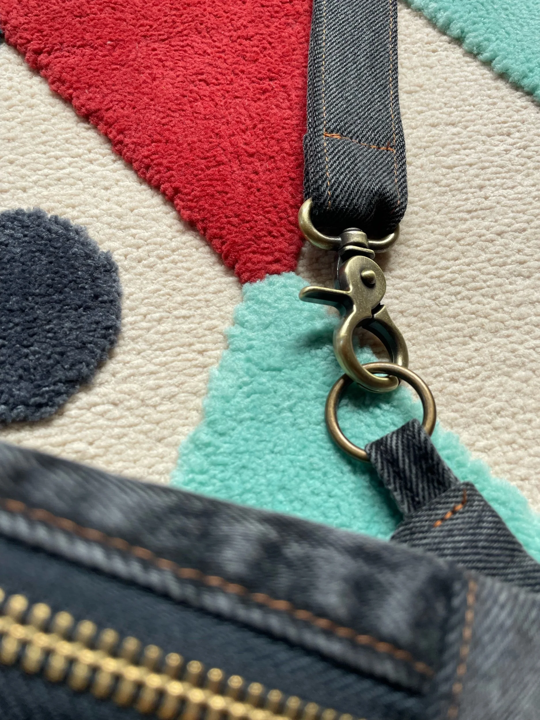 Clip on, adjustable strap approx 90cm. Designed as a crossbody bag.